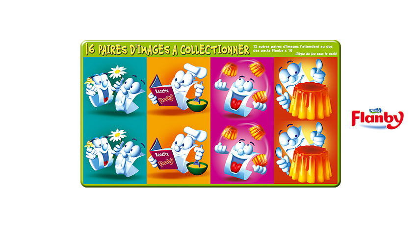 Création graphique et illustration d'une série de jeux figurant sur les packagings des crèmes Flanby de Nestlé.